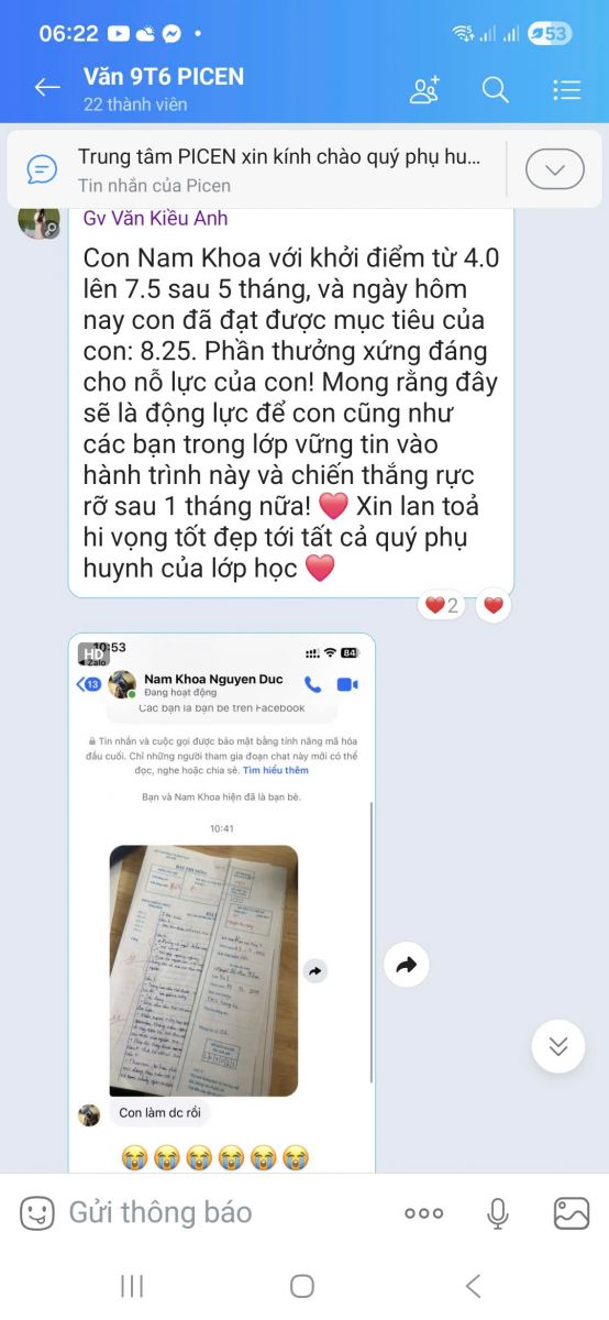 Từ xuất phát điểm 4.0, sau 5 tháng nỗ lực học cô Kiều Anh, Nam Khoa đã vươn lên 7.5 – và hôm nay, con chính thức đạt điểm 8.25 môn Văn đầu tiên. Một điểm số vô cùng giá trị, khích lệ tinh thần của con trong giai đoạn áp lực gần sát kỳ thi vào 10 đầy cam go.
